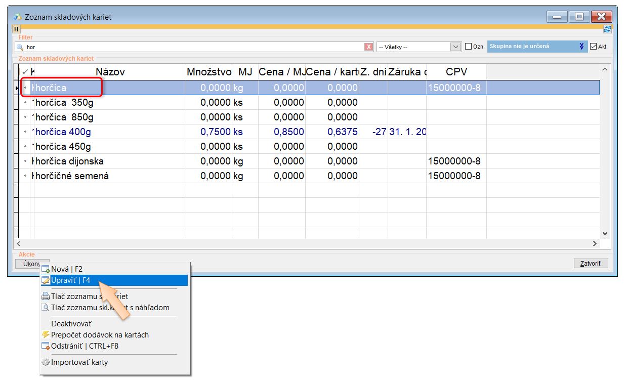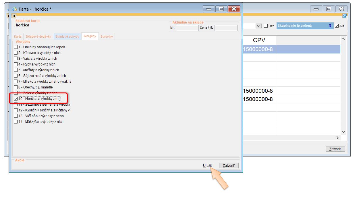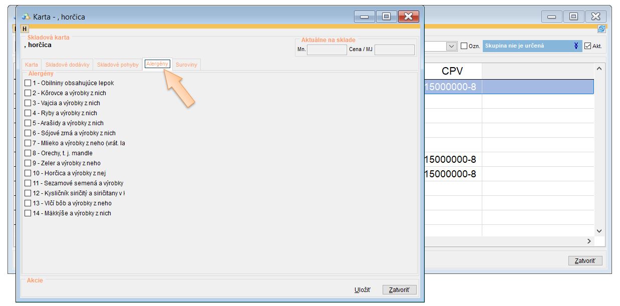 Doplnenie alergénov na skladových kartách