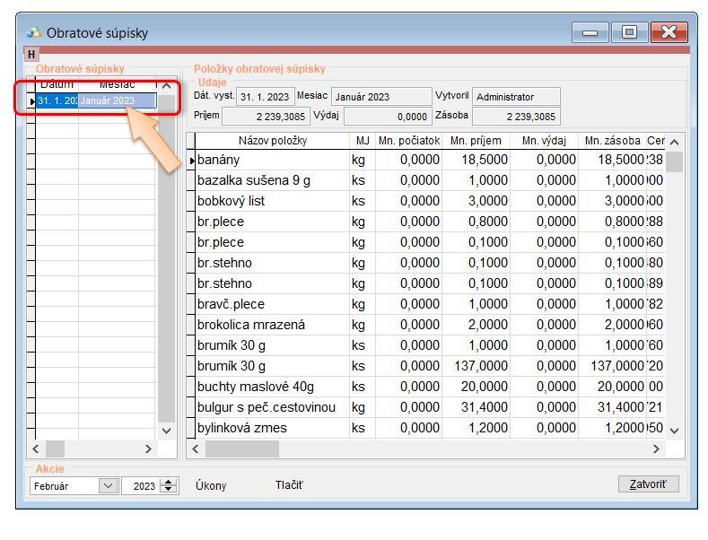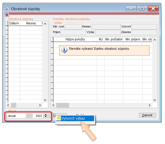 • Vytvoriť Obratovú súpisku skladu za mesiac, ku ktorému boli prenesené počiatočné skladové zásoby.