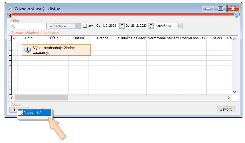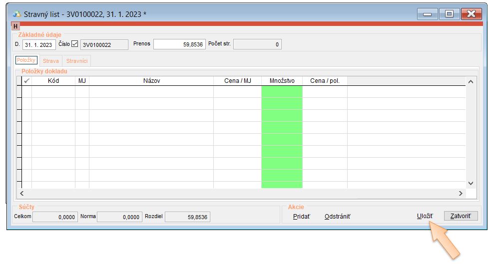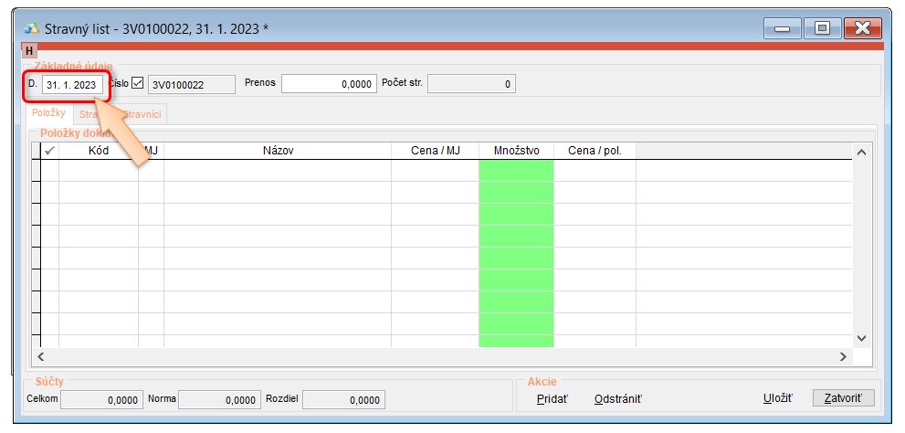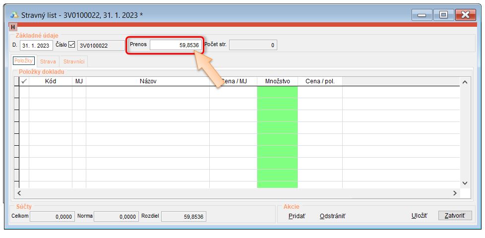 • Vytvoriť počiatočný stravný list ku koncu predchádzajúceho mesiaca od ktorého pokračujete v evidencii, kde sa nahodí zostatok.
