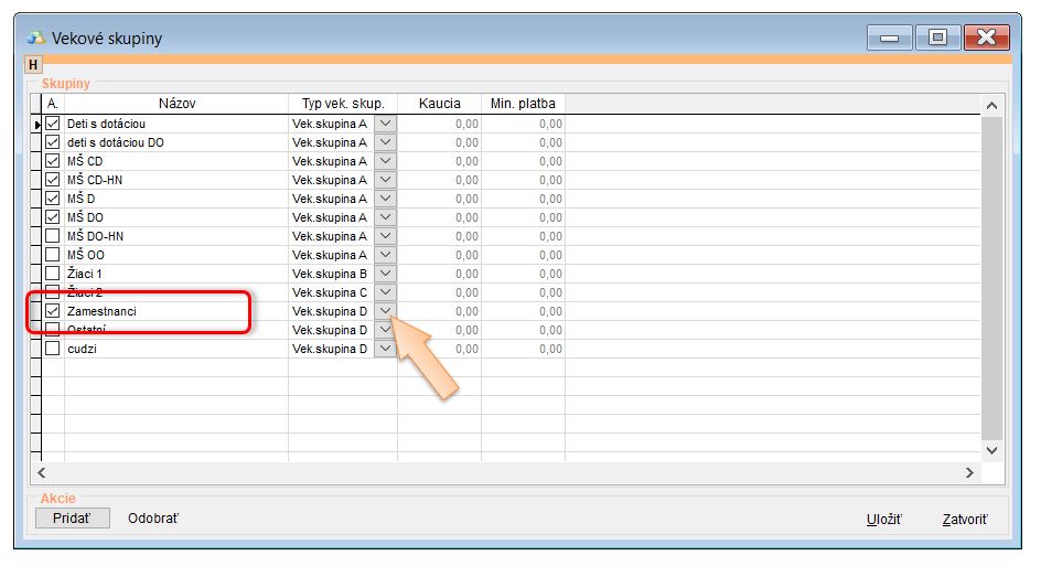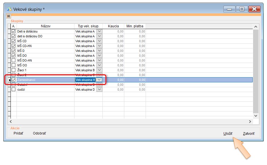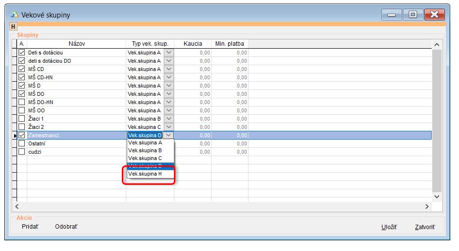 • Upraviť Vekovú skupinu pre dospelých stravníkov. (Nastavenia - Vekové skupiny - nastavenie vek. skupiny H pre dospelých a cudzích stravníkov.)