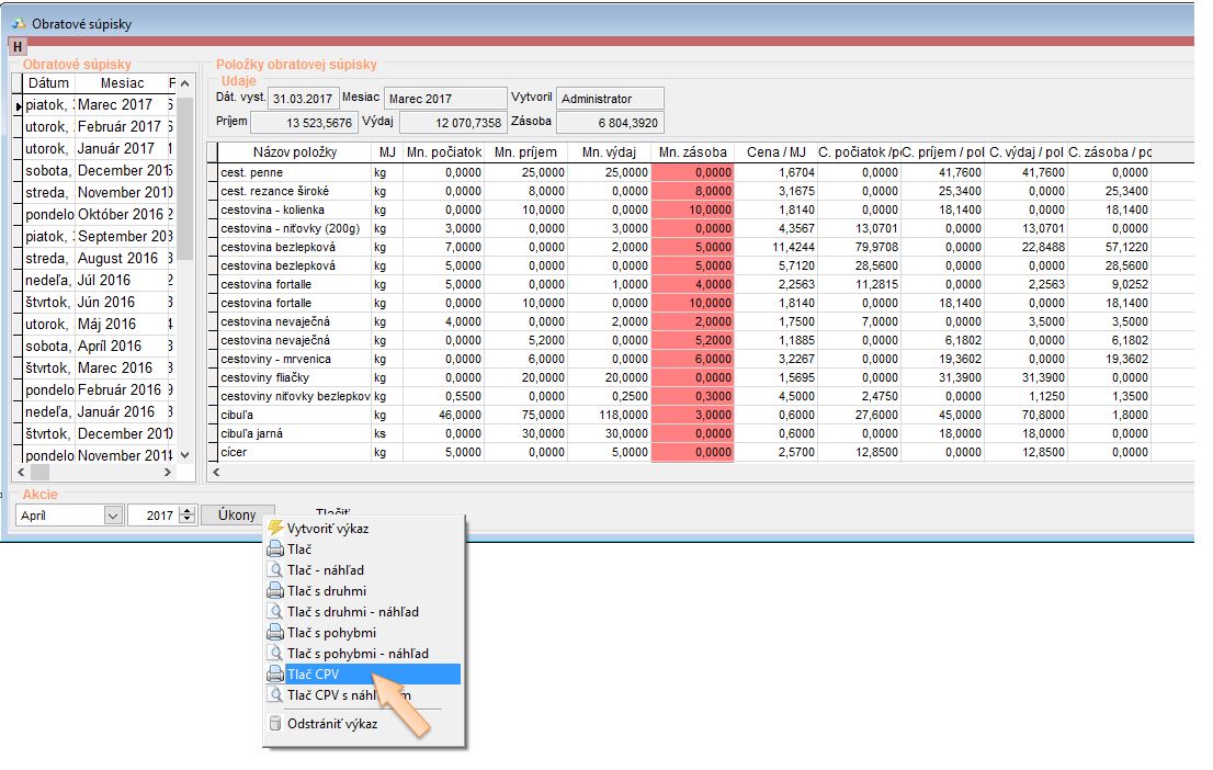 Výkaz CPV vychádza z Obratových súpisiek v aplikácii. To znamená, že na to, aby bolo možné tento výkaz vytvoriť, je potrebné mať povytvárané jednotlivé obratové súpisky. Na základe nich dokáže aplikácia vypočítať hodnoty jednotlivých surovín pre potreby klasifikačného systému verejného obstarávania. Ak potrebujete zistiť stav CPV aj v strede mesiaca, je to možné. Je potrebné vytvoriť obratovú súpisku a následne vytvoriť výkaz CPV. Po tomto kroku je možné obratovú súpisku odstrániť a opätovne ju vytvoriť ako bežne až na konci mesiaca. Výkaz CPV vie aplikácia na základe skladových kariet a kódov CPV vytvoriť aj spätne. Ak potrebujete vytvoriť výkaz napr. za rok 2017, ale v januári a februári na skladových kartách ešte CPV nebolo nastavené, nevadí to. Aplikácia vie, o ktoré karty sa vo výkaze jedná a ak majú aktuálne kód CPV pridelený, aplikácia ich do výkazu zahrnie.
