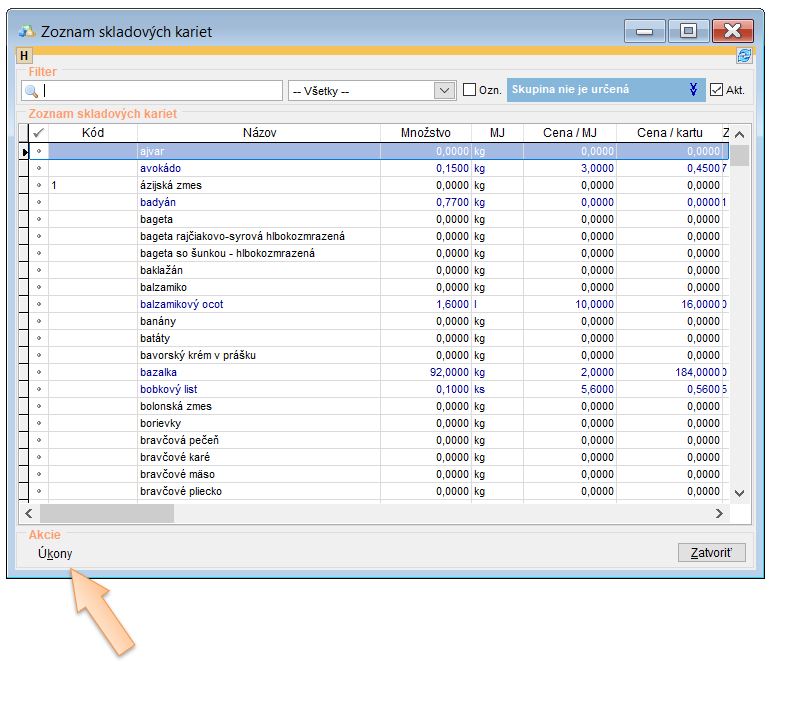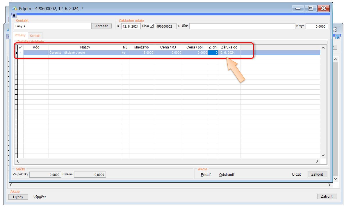 Takto vytvorenú skladovú kartu viete evidovať aj na sklade. Stačí vybrať dodávateľa, vyhľadať príslušnú kartu školského ovocia, zadať množstvo a nulovú cenu.