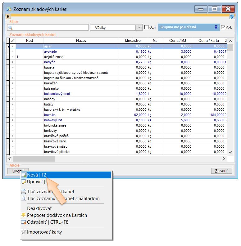Vytvorenie karty pre evidenciu skladu