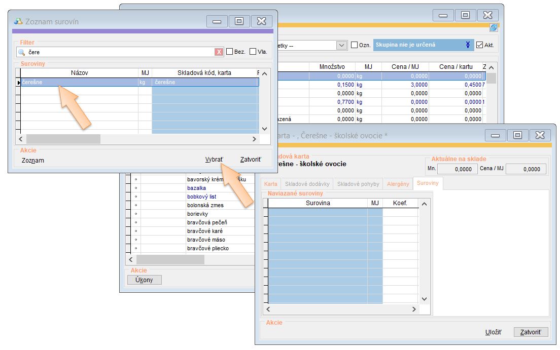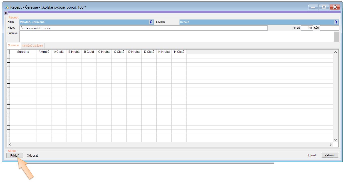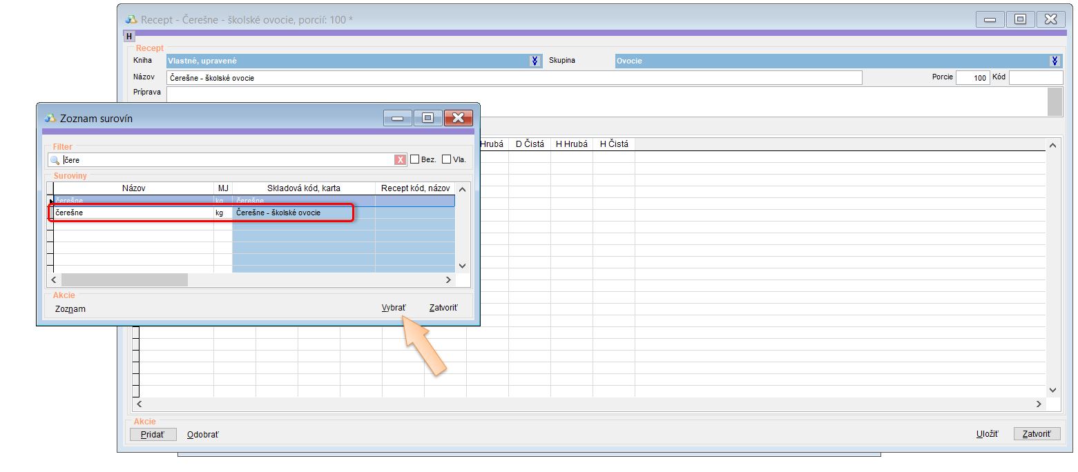 - Kliknite na Pridať a vyhľadajte surovinu. (V našom prípade Čerešne - školské ovocie.)