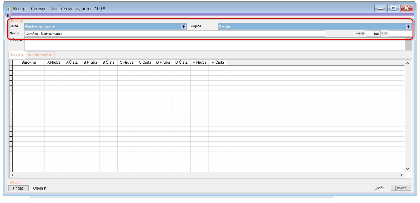 - Vypňte Názov receptúry. (V našom prípade Čerešne - školské ovocie.)
