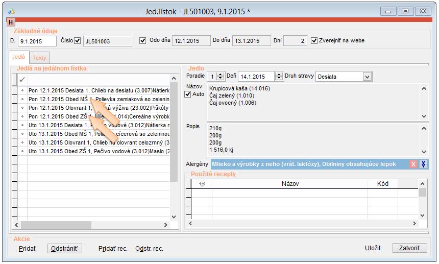 - Ak ste nadefinovali v nastaveniach v časti Číselné rady druhov aj nový druh pre Jedálne lístky, vyberte v stĺpci Druh jedálneho lístka aj nadefinovaný tento druh.