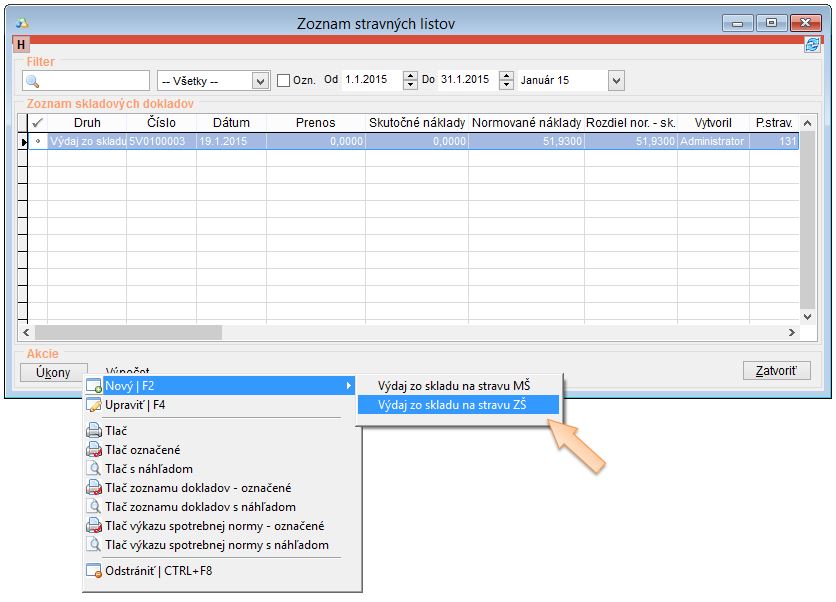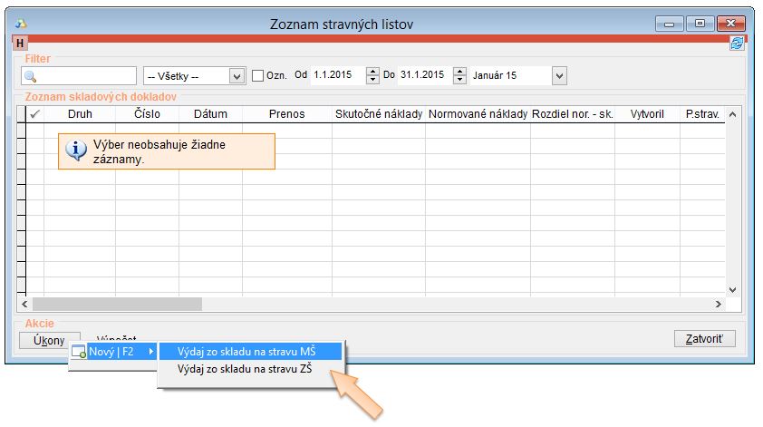 - Kliknite na tlačidlo Úkony -> Nový a vyberte druh stravného listu. (Ďalšie informácie o stravných listoch a ich vytvorení sa dozviete v ONLINE video kurze iKelp Jedáleň - ONLINE videokurz v časti Skladová evidencia v lekcii číslo 8, alebo v návode Stravná výdajka.)