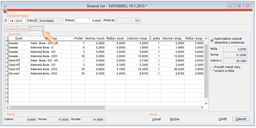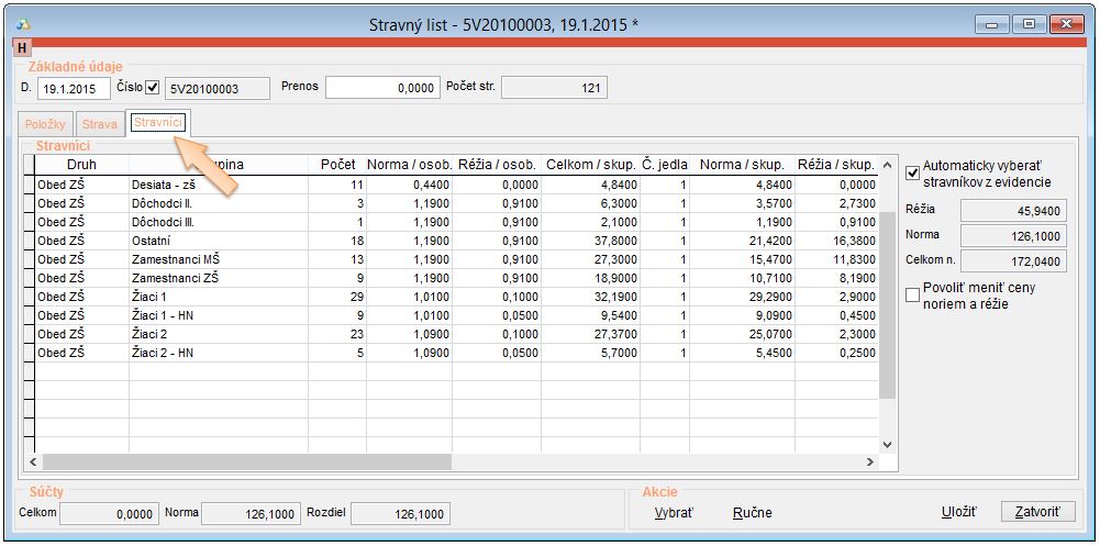 Ak boli správne vykonané potrebné všetky nastavenia, aplikácia sama automaticky vydá zo skladu tovar na základe prihlásených stravníkov na jednotlivé druhy jedál.