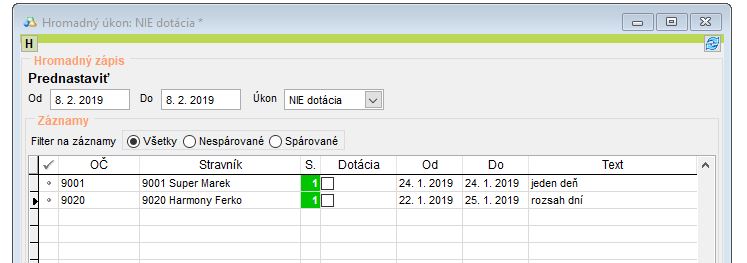 • Pri následnom importe a nastavení NIE dotácia je vybraným stravníkom zrušený nárok na dotáciu.