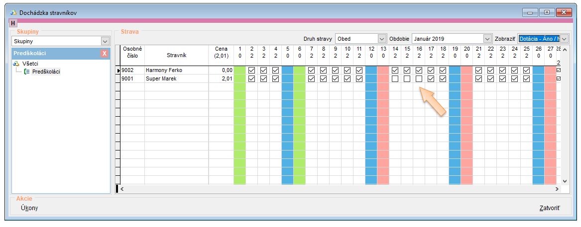 • Na dni, ktoré sú označené v zozname fajkou, stravníkovi je aplikovaná dotácia. (Ak sa v niektorom dni fajka nenachádza, stravník na tento deň nie je prihlásený, alebo nemá nárok na dotáciu.)s