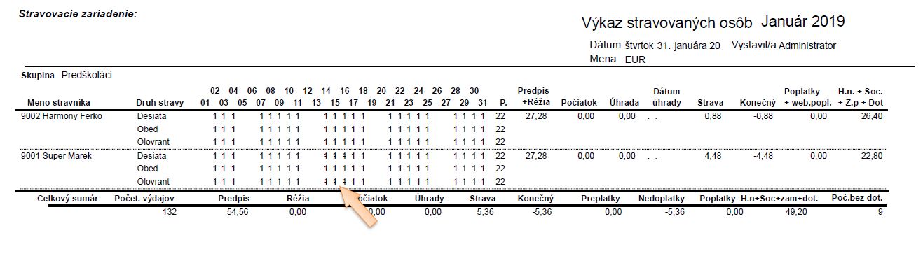 • Dni, na ktoré bol stravník prihlásený ale nemá nárok na dotáciu sú na výkaze prečiarknuté.
