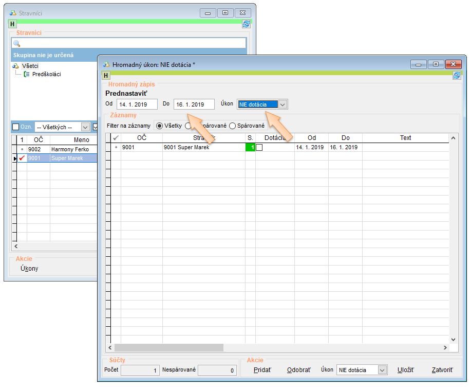 • Nastavte úkon NIE dotácia pre zrušenie dotácie vybraných stravníkov.