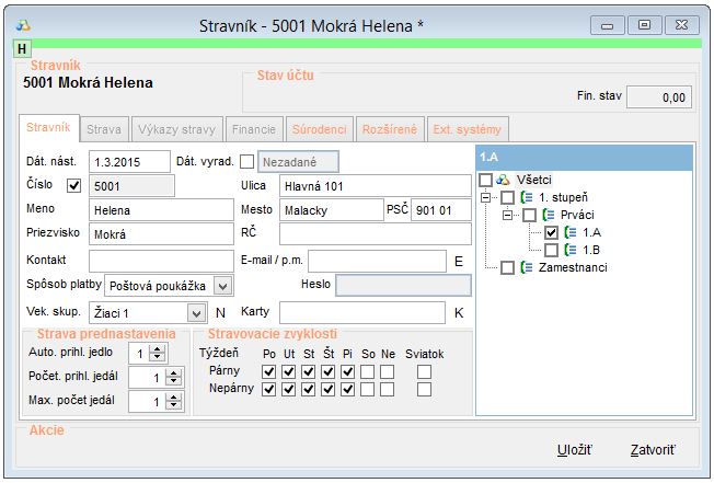 Stravník - v záložke je potrebné vyplniť základné informácie o stravníkovi, jeho kontaktné údaje spôsob platby, vekovú skupinu a pod.