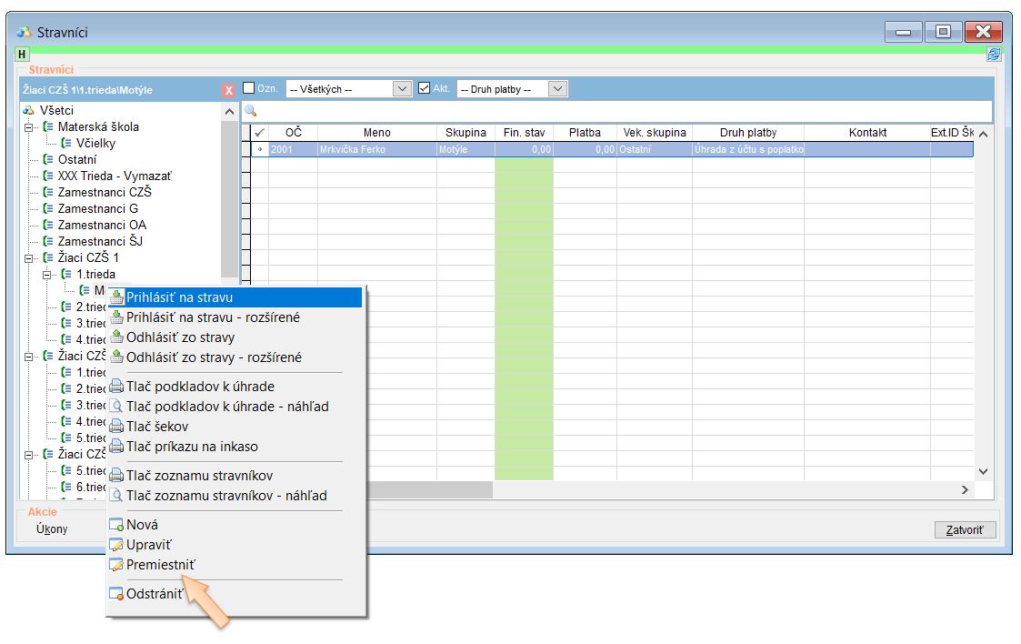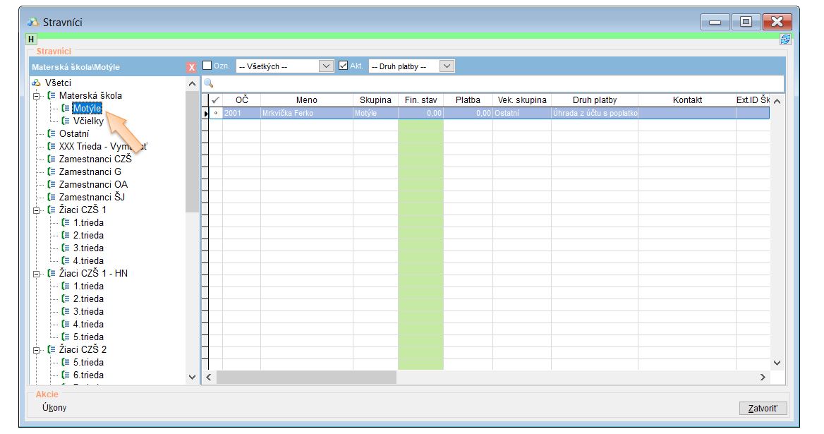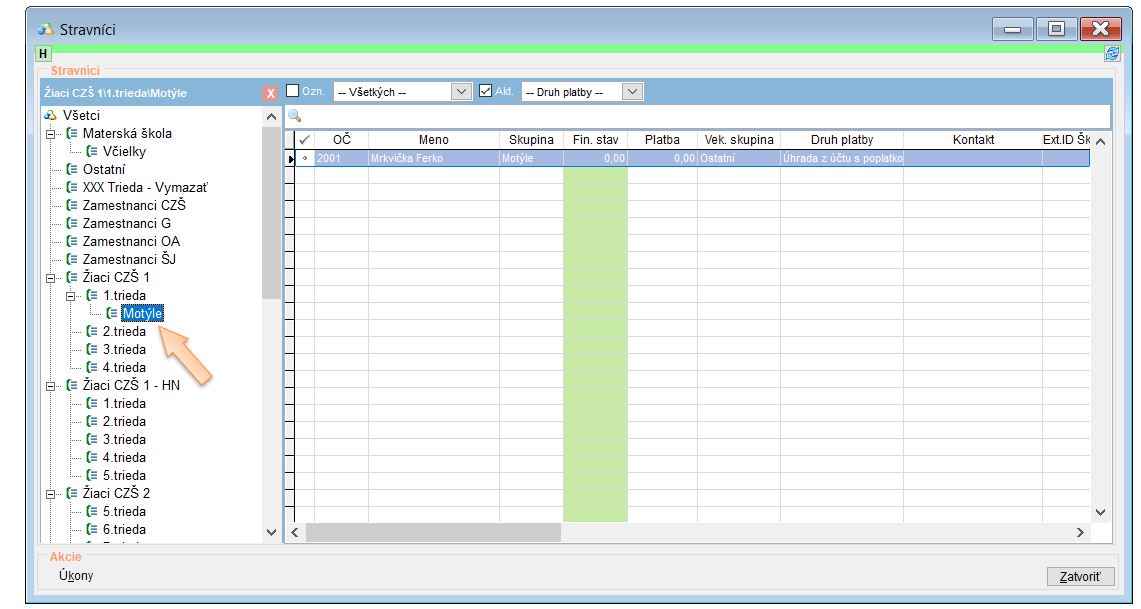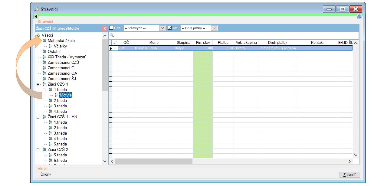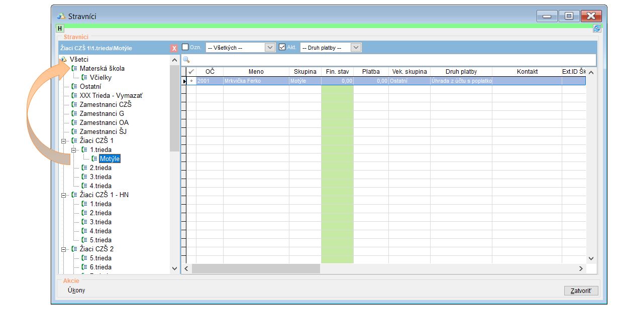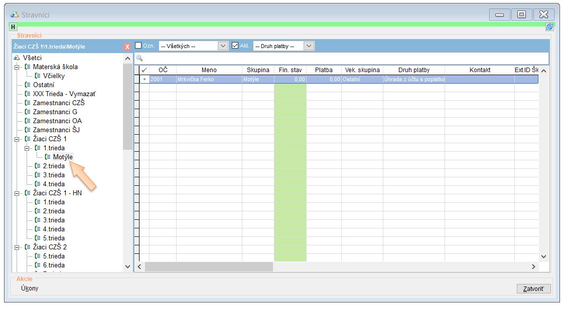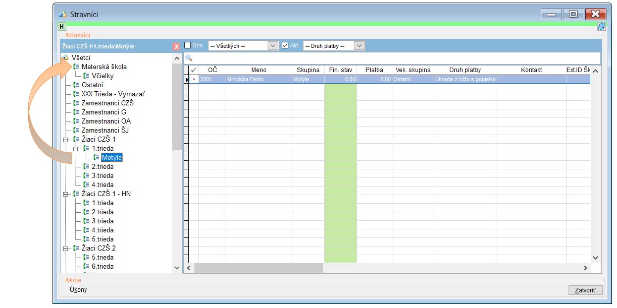 Ak sa vám pri práci stalo, že sa premiešali skupiny stravníkov (napr. skupina Motýle (trieda z MŠ) sa premiešali so skupinou stravníkov z Žiaci 1) nevadí. V tomto návode nájdete postup, ako túto sitáciu riešiť. Stravníci stále zostávajú zaradený v príslušných skupinách, takže k ich premiešaniu reálne nedošlo. Len v zozname stravníkov sa zobrazujú spoločne, pretože ak sa pozeráte na jednu skupinu, vidíte aj stravníkov z podskupiny.
