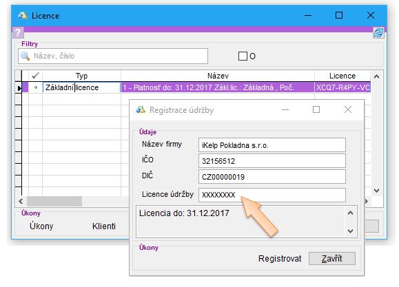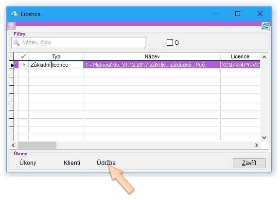 Pokud jsou zaregistrovány všechny přidělené licenční klíče, je potřebné zaregistrovat i licenci údržby. Tato se rovněž nachází na nástěnce, nebo Vám byla zaslaná emailem s licencemi.