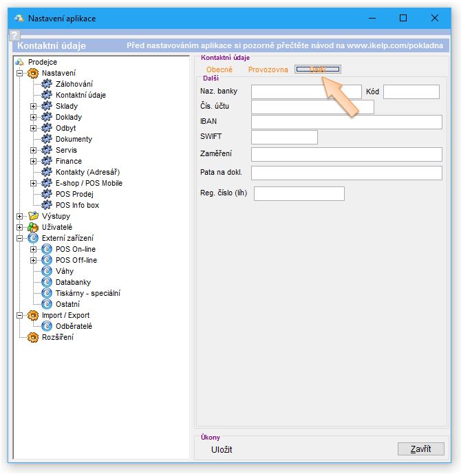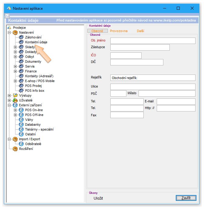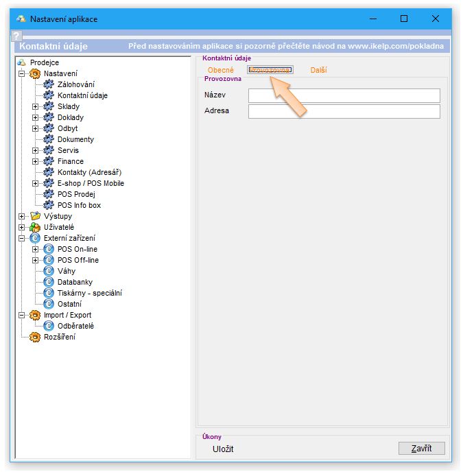 4. Případně kliknutím na záložku Provozovna vyplňte údaje o provozovně. V záložce Další můžete vyplnit ostatní údaje jako jsou např. číslo účtu.