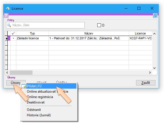 Jako první se v aplikaci registrují jednotlivé licence k produktu.