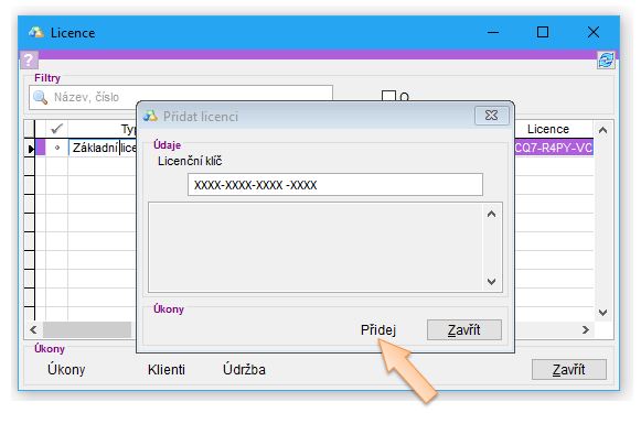 4. Zadejte licenční klíč přiděleného produktu. Jeho přidání potvrdíte kliknutím na tlačítko Přidej.