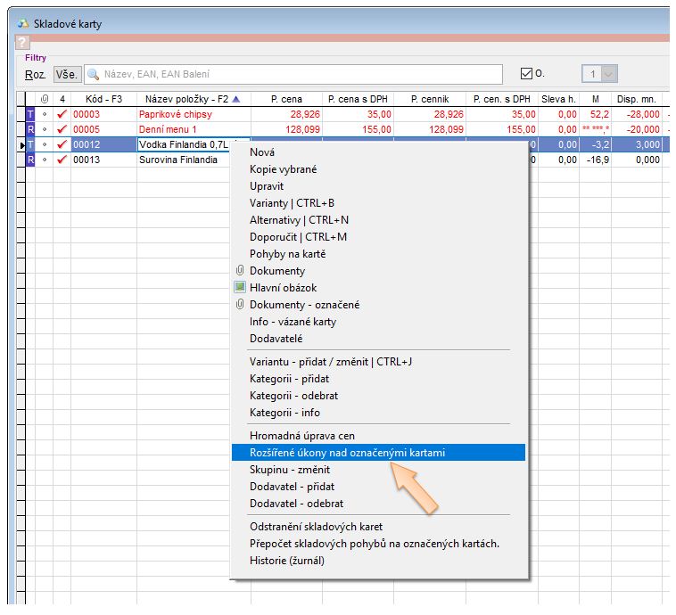- Označte skladové karty, kterým chcete tento příznak změnit a pravým tlačítkem myši klikněte do seznamu karet např. v sloupci "Název položky".