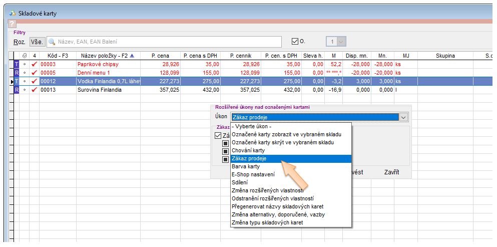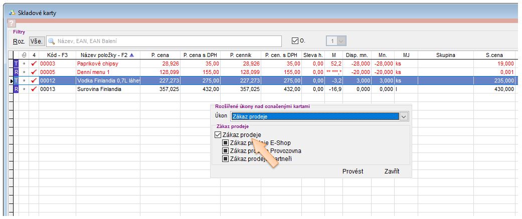 Nastavení zákazu prodeje skladovým kartám můžete přidat i hromadně, nemusíte ho nastavovat pro každou kartu samostatně.