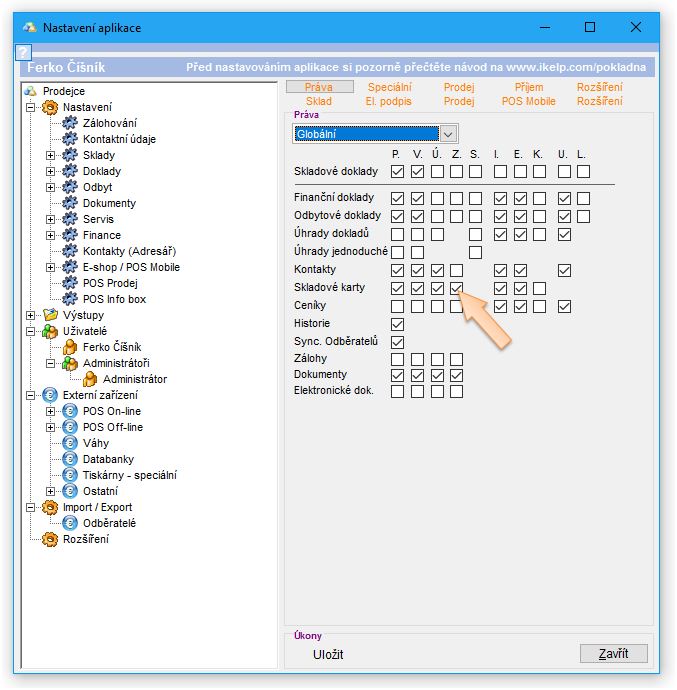 - V pravé části v záložce Práva -> Skladové karty, aktivujte možnost pro "Z" (Smazání).