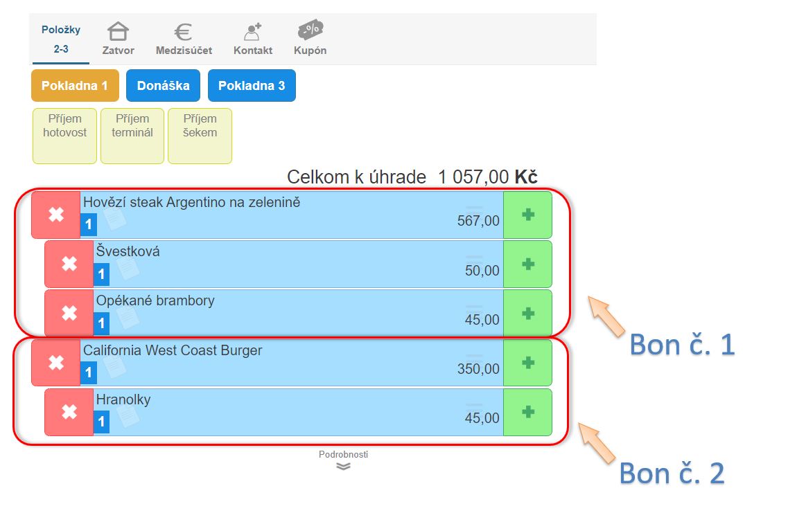 V tomto návodě najdete podrobnější informace o možnostech nastavení tisku bonovacích lístků, a to samostatně a pro jednotlivá jídla. Tento scénář je vhodný např. v bufetových nebo FastFoodových provozovnách, kde má přípravu jídla na starosti více lidí. Takto se pro každého zvlášť na zařízení vytiskne bon, bony si mezi sebou rozdělí a každý připraví svou část objednávky. Pote se zkompletuje a odevzdá zákazníkovi. (Příklad: Osoba A zadá do systému objednávku zákazníka, po dokončení objednávky se tisknou bonovací lístky. Následně osoba B předá vytisklé bony dál, ale nechá si bon pro přípravu jeho časti objednávky, vezme tác a připravuje. Po přípravě položek posune tác osobě C, ten na ni doplní jeho část, a posune osobě D. Tento doplní svou část, objednávku zkompletuje a odevzdá zákazníkovi.)