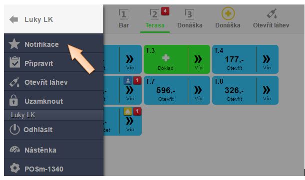 Okrem zobrazenia správy o notifikácii v miestnosti a na danom stole, je k dispozícii aj zoznam všetkých notifikácií v Menu aplikácie, kliknutím na Notifikácie.