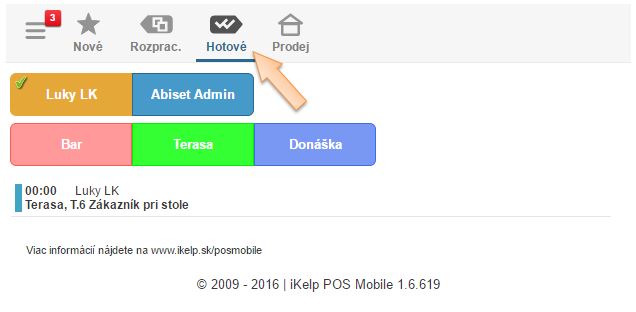 - Zoznam aktívnych notifikácií je možné filtrovať na jednotlivé miestnosti, kliknutím na ikonu je možné zmeniť ich stav na Rozpracované alebo Hotové. V príslušnej záložke je potom možné zobraziť rozpracované, alebo hotové notifikácie. Akonáhle je doklad ukončený, notifikácie sú zo systému odstránené.