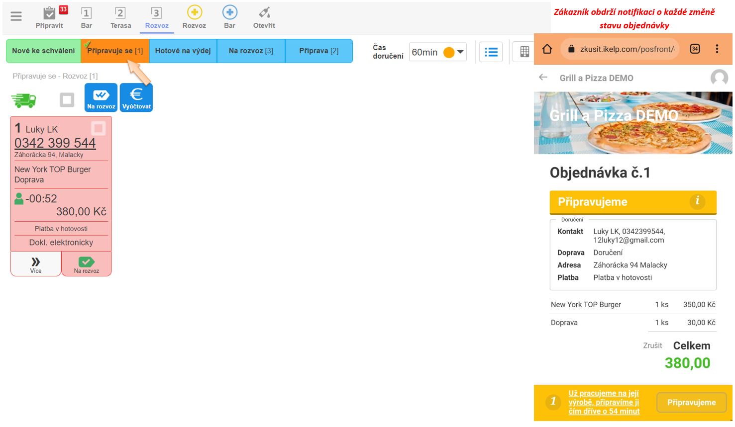 - Zákazník vytvoří online objednávku a vidí stav Přijatá, Čeká se na obsloužení personálem. (Pro svou oblast doručení vidí např. 45min.)