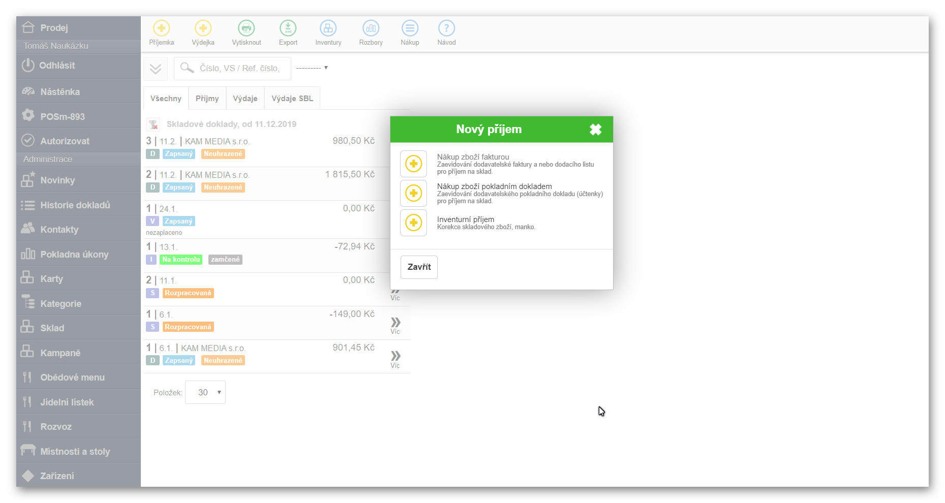 Po kliknutí na tlačítko + Příjemka v sekci sklad se zobrazí okno s možností pro příjem zboží na sklad.