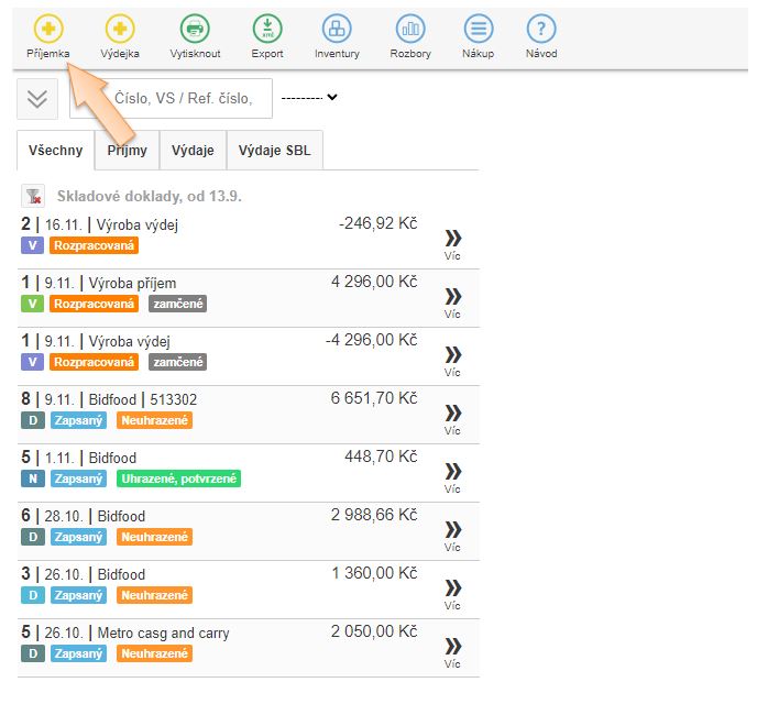 2. Kliknutím na + Příjem vytvoříte skladový výdej.