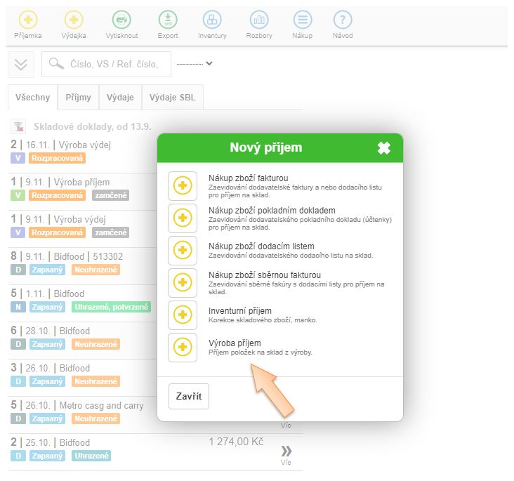 3. Vyberte typ Výroba příjem.
