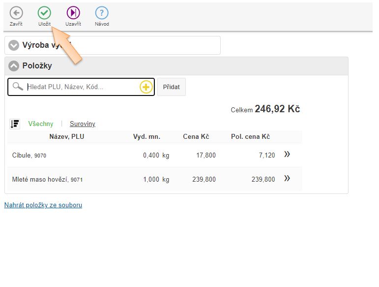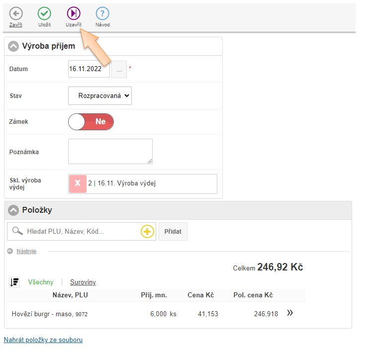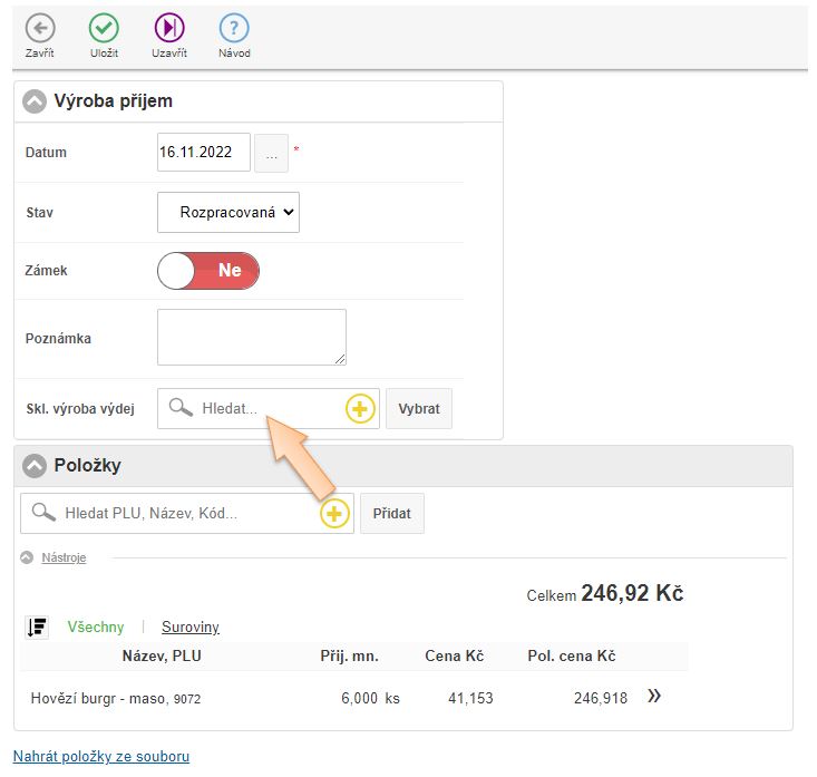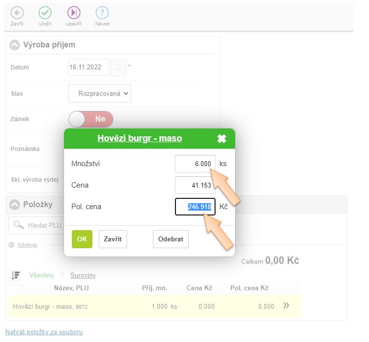 4. Vložte položky do dokladu, které vznikají výrobou, zadejte množství a skladovou cenu.