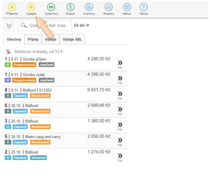 2. Kliknutím na + Výdejka vytvoříte skladový výdej.