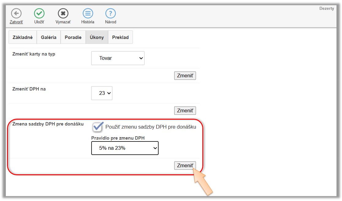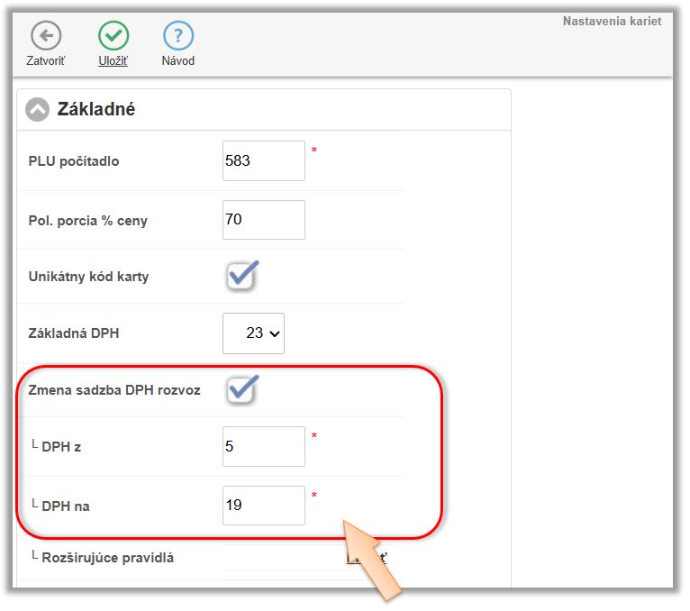 - Aktivujte nastavenie Zmena sadzby DPH pre rozvoz.
