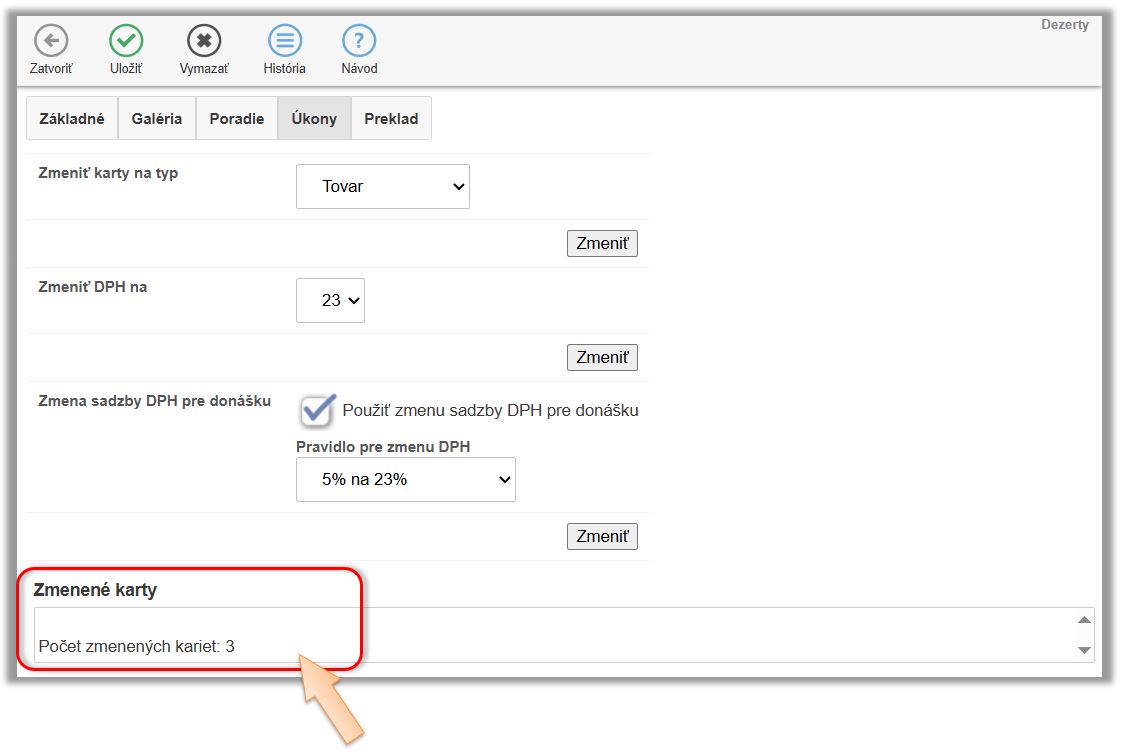 - V časti Zmena sadzby DPH pre donášku aktivujte (začiarknite) Použiť zmenu sadzby DPH pre donášku. (V prípade, že robíte zmenu na kategórii, ktorá obsahuje ďalšie podkategórie, zmena výšky DPH sa aplikuje aj na podkategórie. Pozor, zmena výšky DPH sa nemusí týkať všetkých kariet. Preto odporúčame robiť zmenu na kategoriách, v ktorých sú zaradené len položky ktorých sa zmena týka.)