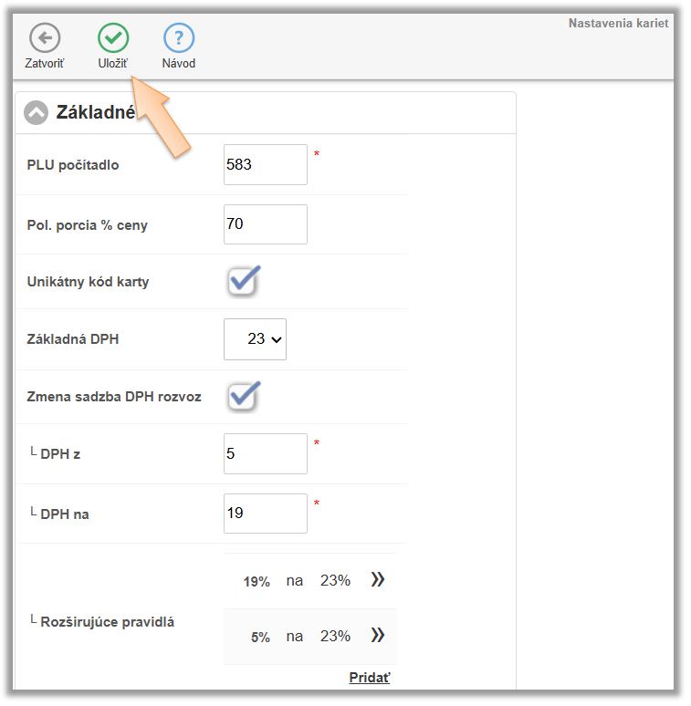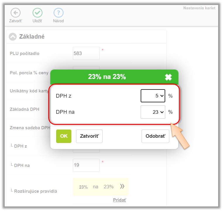 - V časti Rozšírujúce pravidlá kliknite na Pridať. (V časti Zmena sadzby DPH pre rozvoz sa nastavuje tzv. základná sadzba pre DPH. V prípade predaja zákuskov, kde dochádza k zmene DPH z 5% na 23% stačí nastaviť túto DPH. V prípade, že ponúkate tovary, kde pri niektorých sa DPH mení z 5% na 19% a pri iných z 5% na 23% je potrebné pridať rozširujúce pravidlo.)