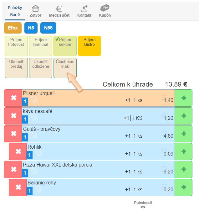 - Pomocou Čiastočne inak je možné doklad zaplatiť rôznymi platidlami. (Napr. časť stravnými lístkami, časť hotovosťou.)