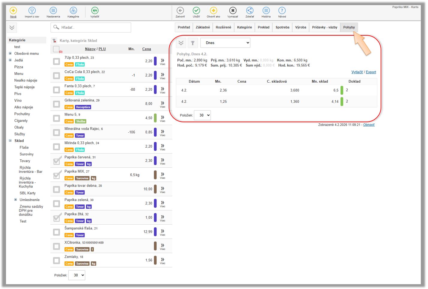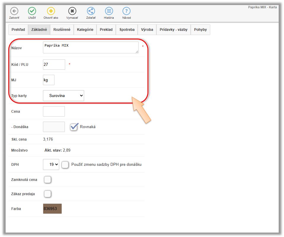 - Karta typu Surovina. (V našom prípade Paprika MIX.)