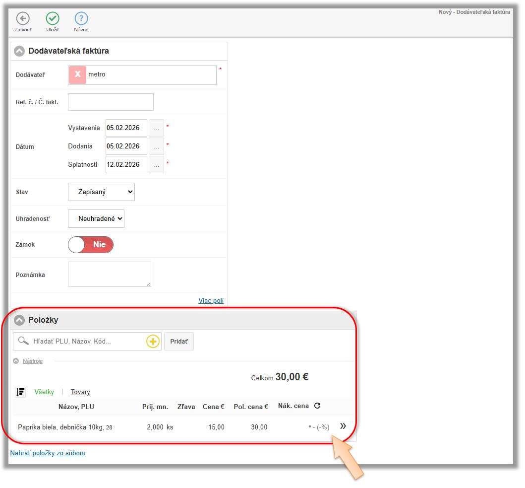 - Zajte položky pre príjem podľa dokladu od dodávateľa.