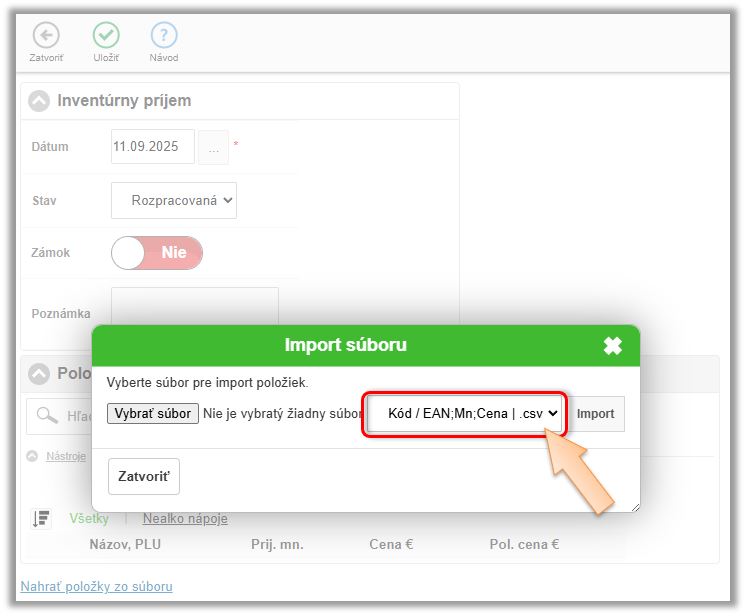 Po kliknutí na tlačidlo + Príjemka v skladovej časti aplikácie, sa zobrazí okno s možnosťami pre príjem tovaru na sklad.