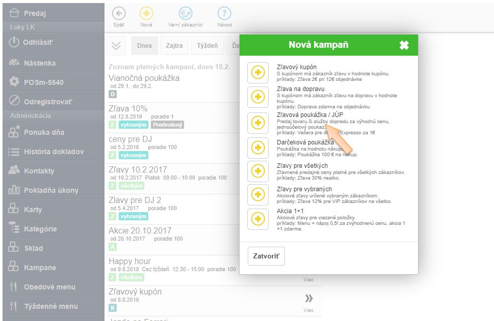- Vyberte zo zoznamu typ kampane Zľavová poukážka / JÚP.