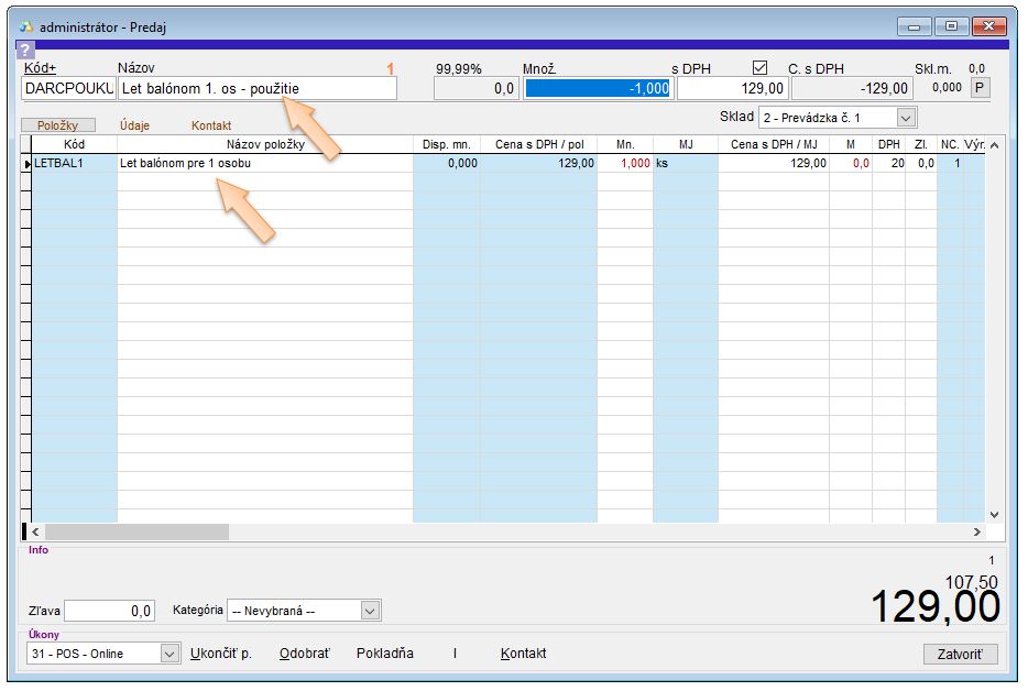 - Bežne predajný tovar / služba - druhá karta pre daný tovar / službu, ktorá môže byť predávaná samostatne, alebo môže byť na ňu uplatnený poukaz.
