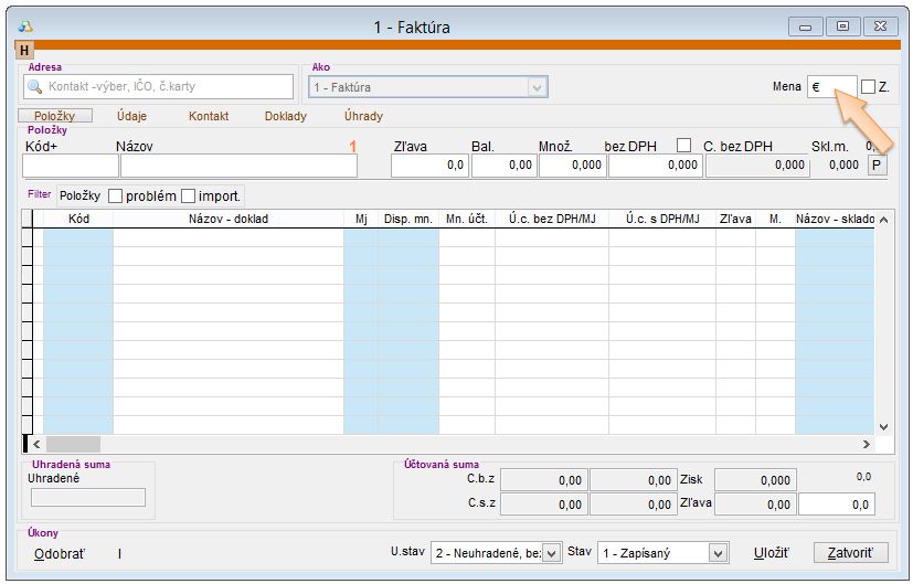 Ak sú v nastaveniach aplikácie vykonané príslušné nastavenia a je zadefinovaná mena, v ktorej chcete doklad vystaviť, postupujte nasledovne. Pozor, menu je potrebné nadefinovať pred pridaním prvej položky do dokladu!