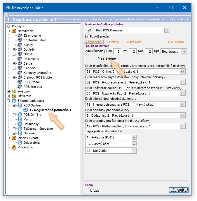 - V nastaveniach aplikácie je potrebné v časti Externé zariadenia - POS Online vybrať konfiguráciu príslušného zariadenia (pracoviska).