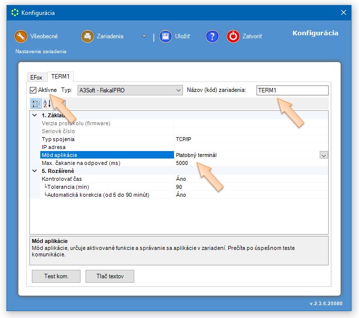- V prípade zariadenia FiskalPro v móde Fiskálna tlačiareň a Platobný terminál, je potrebné nadefinovať komunikačné parametre a aktivovať mód Platobný terminál - Áno.