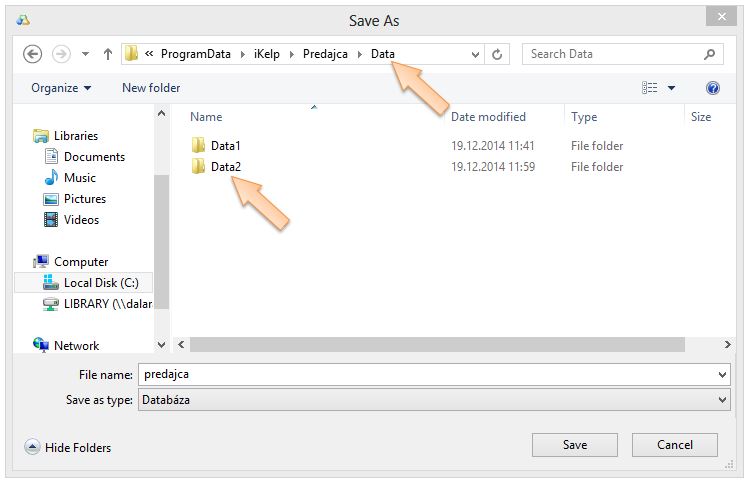- Vyberte umiestnenie databázového súboru a vytvorte nový podadresár s príslušným číslo (napr. Data2). Pozor, nevytvárajte novú databázu priamo v adresári s názvom Data, ale vytvorte podadresár.