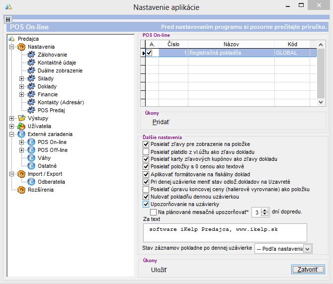 - V ľavej časti okna, v strome jednotlivých nastavení vyberte možnosť Externé zariadenia -> POS On-line.