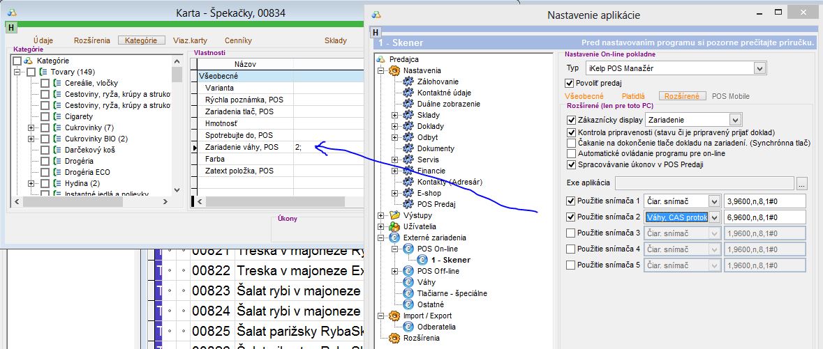 V prípade, že máte k pokladni pripojených viac ako jednu váhu, je potrebné skladovým kartám definovať z ktorej váhy pri vybratí konkrétnej položky bude aplikácia očákavať zaslanie informácie o hmotnosti tejto položky. V nastaveniach poradové číslo váhy definuje číslo Použitie snímača. Číslo váhy následne na skladovej karte nastavíte v záložke Kategórie -> Zariadenie váhy, POS.