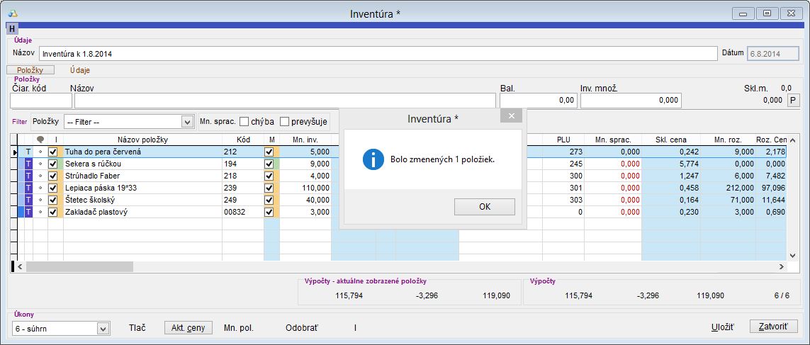 Úspešné uzatvorenie inventúry po vykonaní aktualizácie a úprave skladových cien.